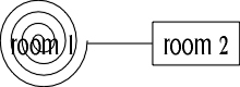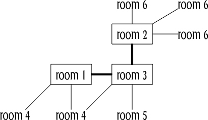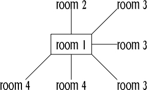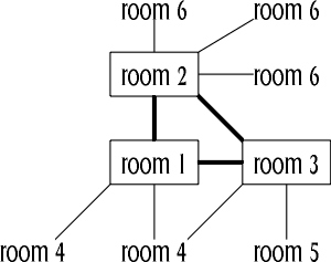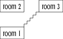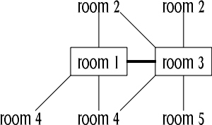 Now we come across our first problem. If we use this representation, where a vertical line up from a room means "north" and a horizontal line to the right means east"" and so on, we get a very intuitive map but it only allows for 8 directions. MUD2 has 14 directions, the extra ones being: in, out, up, down, jump, swamp. How can we accommodate those?