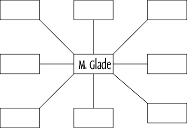 When you start mapping an area, write down the name of the room, which is to say its short description or some shorthand thereof. Use auto exits or qn to find out what rooms are adjacent and put in tentative links to these rooms. Then put a box round the first room: this means you've "done" it. Don't worry if several directions link to the same room, you can pick the best one later. As for scale, start off with a big one - you never know when some little collection of rooms is going to appear that you'll want to be able to squeeze in. At this stage, you may have something that looks like this: