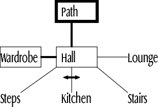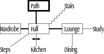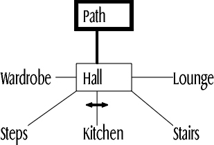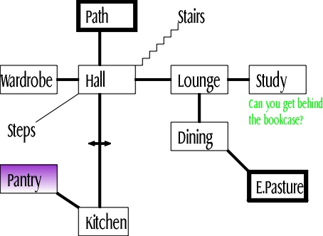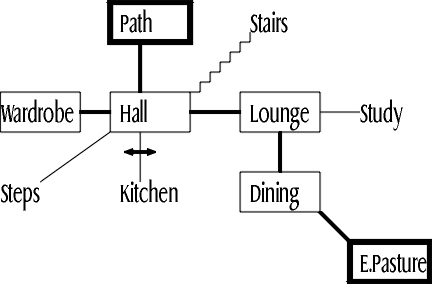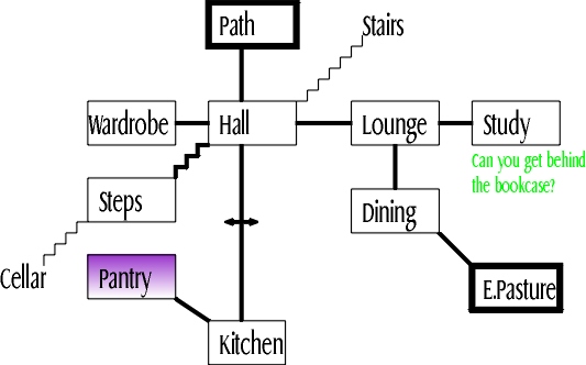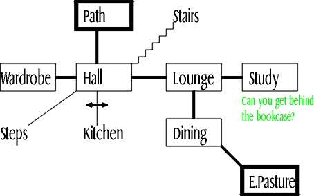 For the purposes of discussing overview maps, I'll look at the map that's available within the game itself. It's actually a set of instructions for drawing an overview map, rather than an ASCII picture or anything, but they're easy enough to follow. The map is usually to be found in the study in the cottage. If we construct it, we get something like this:
