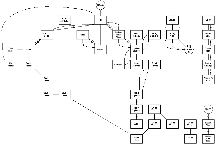 To prove that this technique can really be used efficiently, here is a complete map of the cottage, including the cellar and small tunnel areas. I drew the first version of this map about 6 years ago, and I still have the priceless original, complete with coffee stains and cigarette burns (yes, I was still a smoker back then.) The present version was drawn using my favourite drawing application, VISIO, which, incidentally, has a feature that you may find very useful during mapping: it can be used to reposition objects while maintaining the connecting lines between them. Note that this drawing1 is rather largish, and may not fit on your screen unless you are using a fairly high resolution (1024x768 or better) video mode.