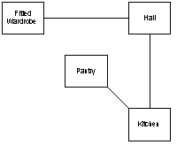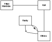 Needless to say, you would be silly to use connections like that on the right side, as they can be very misleading. The trick to avoid having to resort to these is to leave enough space for all the rooms. Often, you place two rooms on your map only to find out that other rooms should really be placed in between these two, either horizontally, or vertically. Take, for instance, the hall and kitchen locations in the map fragment I showed first. Because the pantry is northwest of the kitchen, there has to be enough room between the hall and the kitchen vertically so that the pantry can fit in there. Otherwise it would interfere with the fitted wardrobe. If you realise that there isn't enough space in your map for a particular room, you may need to redraw your map. And this is exactly what I've done often; after an initial sketch, which allowed me to get a feel for the optimal placement of rooms, I created a second, and often a third, copy of my map until I got everything right.