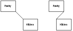 The direction that a line segment defines is determined by where the line connects with the box. Connecting at the middle of one of the sides is used to indicate a main direction (N, E, S, W); connecting at one of the corners is used to represent a secondary compass direction (NE, NW, SE, SW). It is important to note that the line itself may not be lying in the direction that it represents; for instance, the following two diagrams both indicate a NW-SE connection between the kitchen and the pantry: